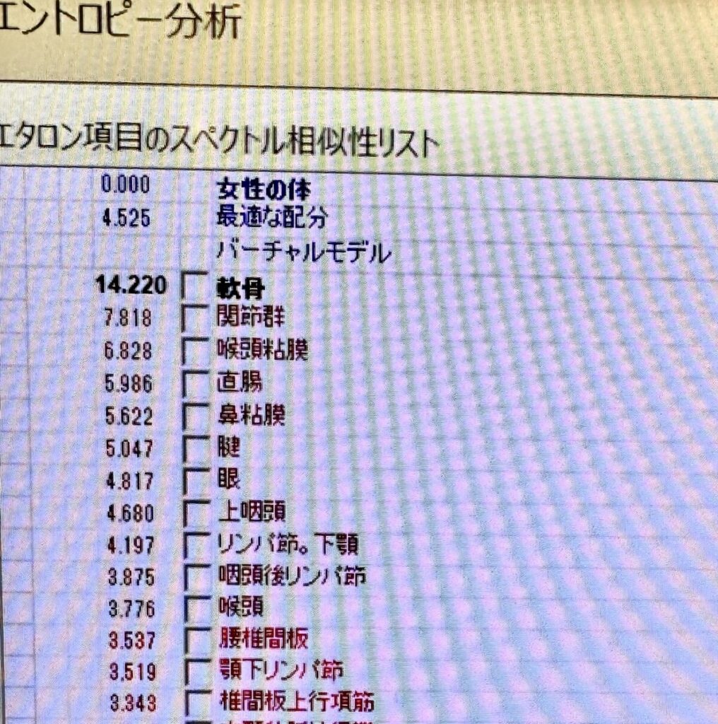 体を構成する細胞からは周波数が発せられている。この周波数を調べることができるのは、ロシアの医療機器「メタトロン」である。測定結果によると、全身測定の結果では、特に軟骨の波形の乱れが強く、関節群・喉頭粘膜・直腸・鼻粘膜・腱・眼・上咽頭・リンパ節。下顎・咽頭後リンパ節・喉頭などに波形の乱れがみられた。