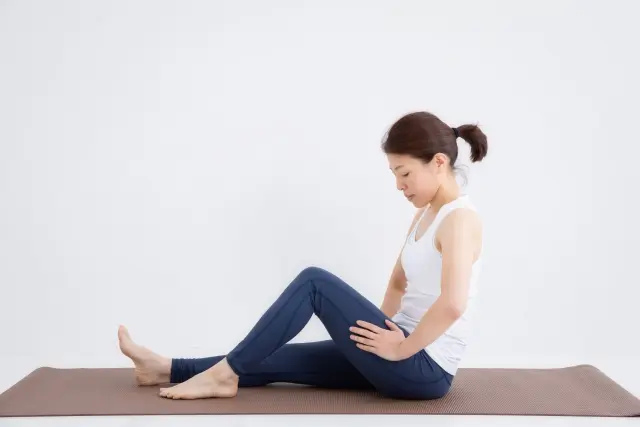 その状態から膝を軽く体の内側に捻るように動かすと、外側広筋がじんわりと伸びるのを感じられるでしょう。この時、反対側の足は床につけたまま安定させることがポイントになります。