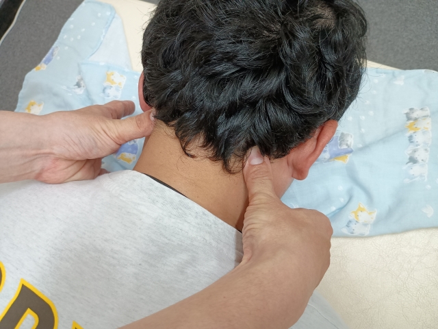 完骨は耳の後ろにある骨のさらに後ろ側、髪の生え際あたりにあります。
