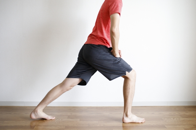 股関節の前側にある腸腰筋が硬くなると、骨盤が前傾して反り腰になりやすくなります。腸腰筋のストレッチでは、片足を前に踏み出して上半身を軽く起こし、足を縦長に広げた姿勢をとります。この時に腹筋に力を入れて背中が反るのを防ぐことがポイントです。自然な呼吸で20秒程度キープし、反対側も同様に行いましょう。