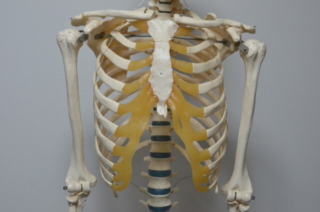興味深いことに、貝殻骨は肋骨の上に載っているように見えますが、実は肋骨と直接骨同士でつながっているわけではないんです。骨を連結させて関節をつくっているわけではなく、筋肉を介してつながっているんですね。それでも肩や腕を動かすことに深く関連しているのは、鎖骨を介して胴体と連結しているためです。
