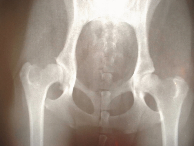 股関節のレントゲン画像を見るときに、まず注目するのが関節裂隙の状態です。裂隙とは骨と骨の間に見える黒い隙間のことで、正常な状態であればこの部分に軟骨があってクッションの役割を果たしています。ところが変形性股関節症が進むと軟骨がすり減るため、レントゲン上では骨同士が近づいて見え、隙間が狭まっていくのがわかります。