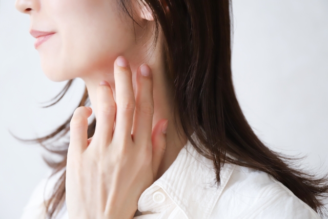 リンパは優しく流すことで循環が促されると考えられています。耳の下から首筋を通って鎖骨へ向かって、指の腹でそっと撫でるように流していきましょう。強く押すのではなく、あくまでも軽いタッチで1日3分ほど続けることがポイントです。炎症が強い時や痛みが激しい時は控えたほうがよいでしょう。