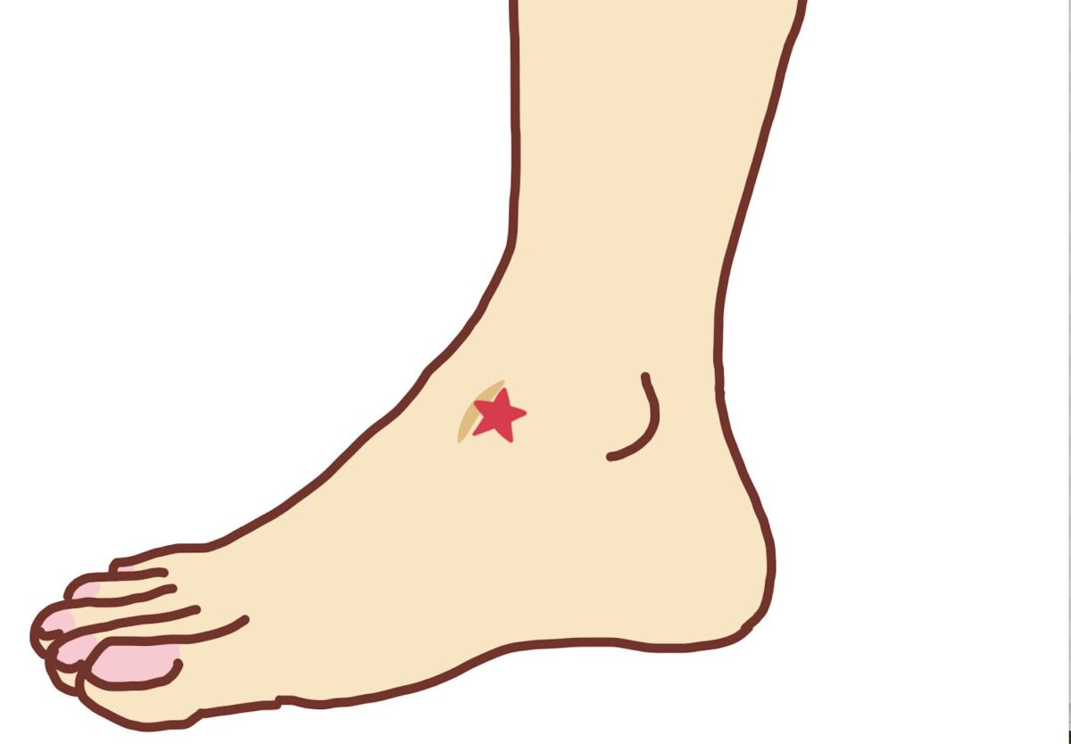 中封を見つけるには、まず内くるぶしを触ってください。その内くるぶしの頂点から指1本分ほど前方に移動すると、前脛骨筋腱という硬い腱が触れます。この腱の内側、つまり体の中心寄りにあるくぼみが中封です。足首を曲げ伸ばしすると腱が動くのがわかりやすく、そのすぐ内側のへこんだ部分を探してみてください。