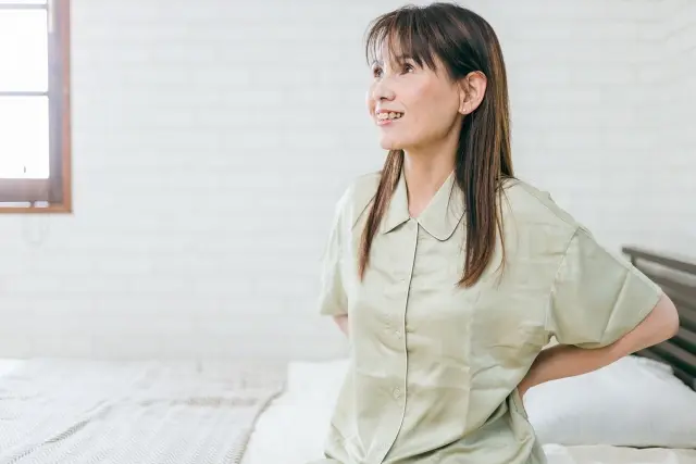 まず腰部の痛みですが、第五腰椎のあたりを中心に、ベルトのラインより少し下あたりに痛みを感じる方が多いです。朝起きたときに腰が固まったように感じたり、長時間同じ姿勢でいた後に動き始めるときに痛みが強くなったりします。