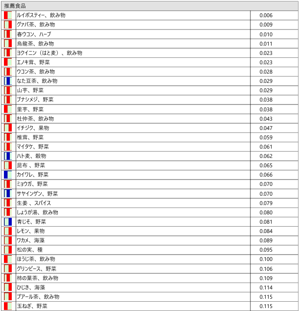 ※測定した時に相性のいい食材は赤、相性の悪い食材は黒く表示されます。