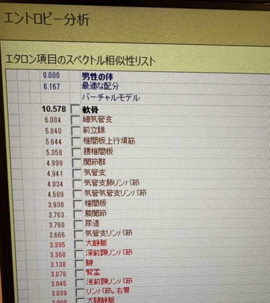 体を構成する細胞からは周波数が発せられている。この周波数を調べることができるのは、ロシアの医療機器「メタトロン」である。測定結果によると、全身測定の結果では、軟骨・細気管支・前立腺・椎間板上行項筋・腰椎間板・関節群・気管支・気管支肺リンパ節・気管気管支リンパ節・椎間板・膝関節・尿道・気管支リンパ節に乱れがあった。