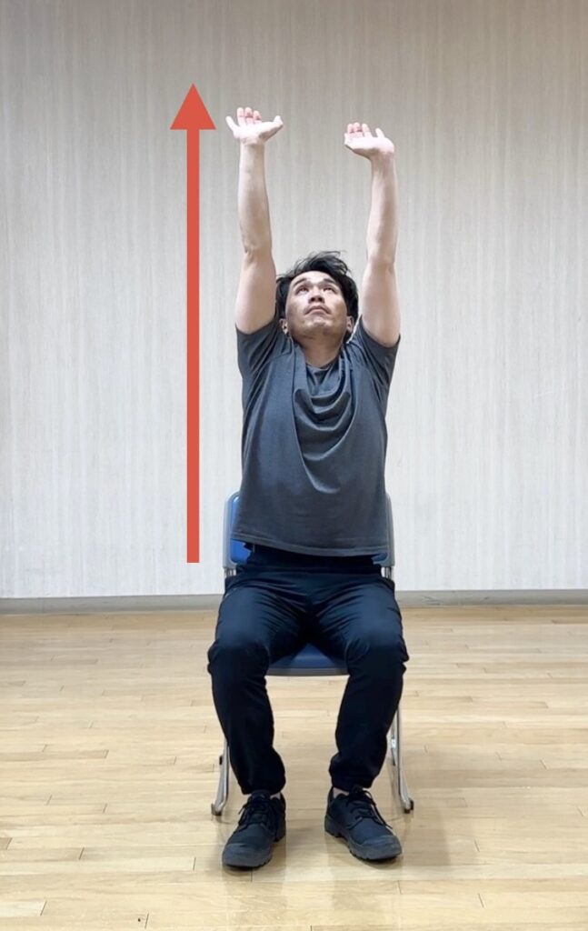 椅子に浅く腰掛け、両手の平を真上に突き上げるようにバンザイをします。その状態から片手ずつさらに上に伸ばしていきます。左右3回ずつ手を突き上げたら手を下ろします。ポイントは脇の下から上に突き上げるイメージであげましょう。