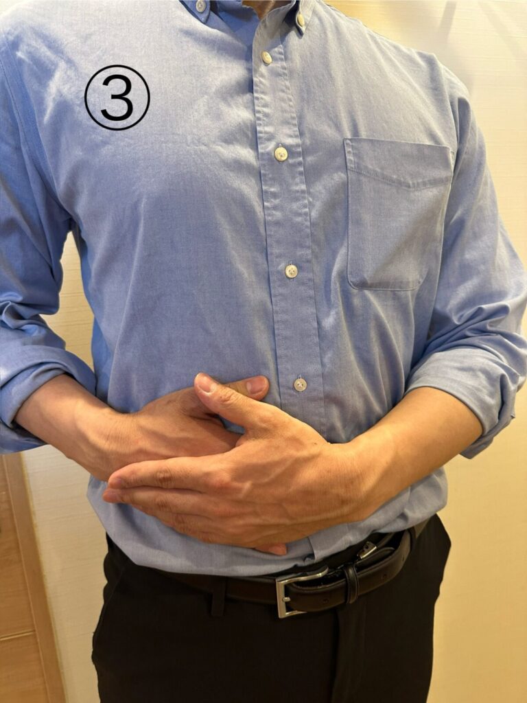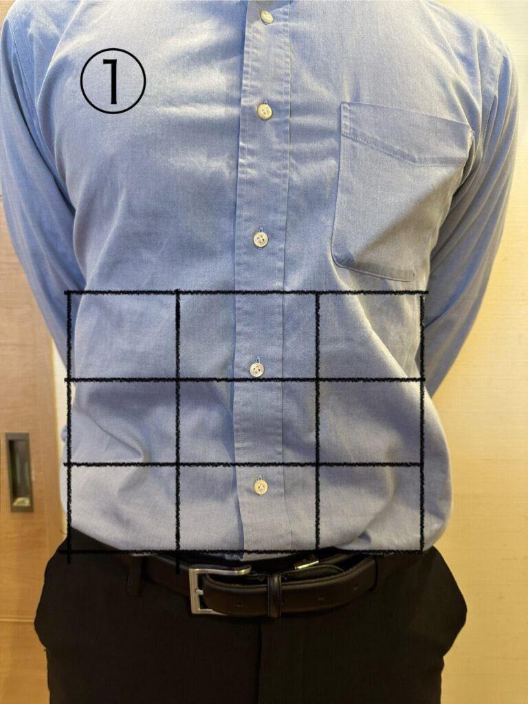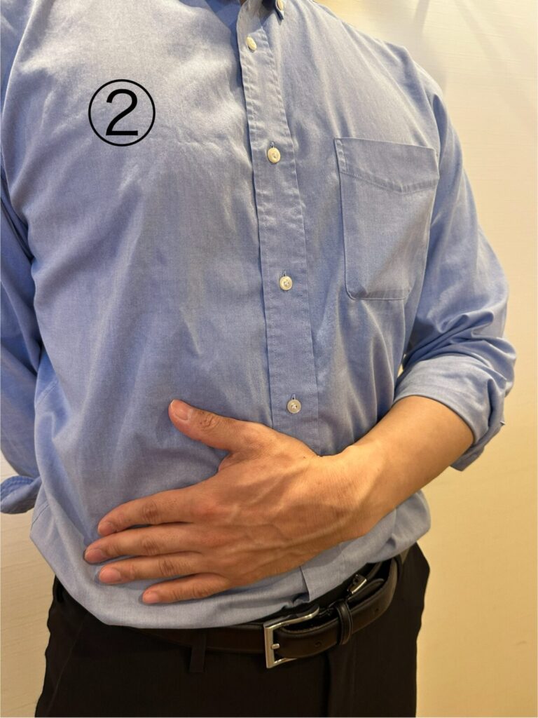 お腹を6つのブロックに分けてください。そのブロックごとにご自身の手のひらを当て10秒間そのままにしているとお腹が温かく、筋肉の緊張が緩んでくる感覚があります。