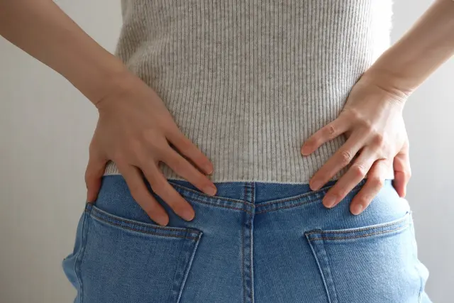 骨盤が前に傾いて腰が反ると、お尻の位置も変わってしまいます。骨盤ごと後ろに引き上がるような形になるので、いわゆる出っ尻のシルエットになりやすく、デニムやタイトスカートをはいたときにヒップラインだけ強調されてしまう方が多いです。本来お尻の筋肉は体を支えたり、歩く時にバランスを取るために働きますが、この状態ではうまく使えず、脂肪がつきやすい環境になってしまいます。